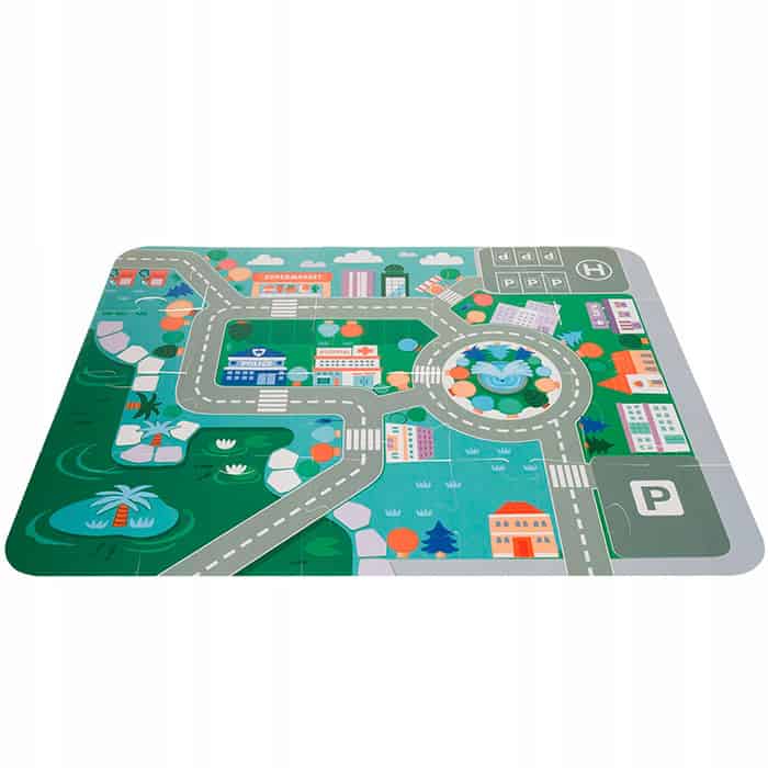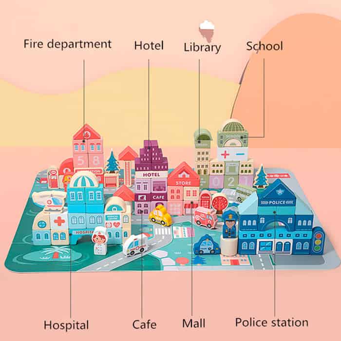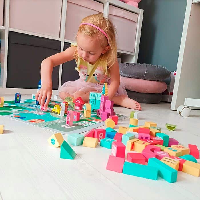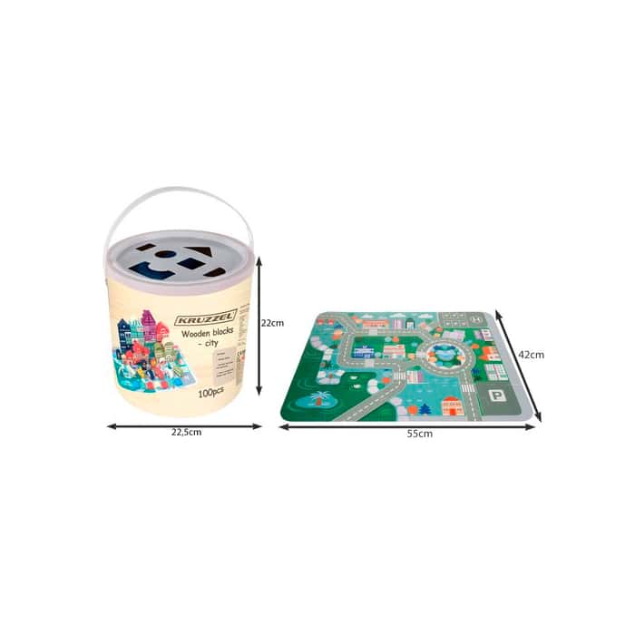 Questo ricco set comprende un set da 100 pezzi di cubi classici di diverse forme con numeri e lettere, cubi raffiguranti case, veicoli, alberi, figure umane, un coperchio per smistare i cubi, un pratico secchio portaoggetti e un tappetino puzzle!