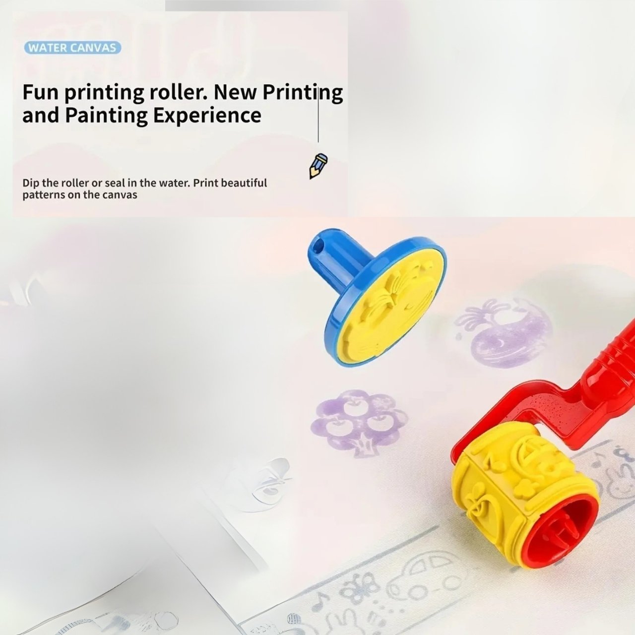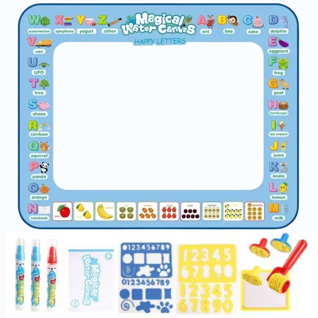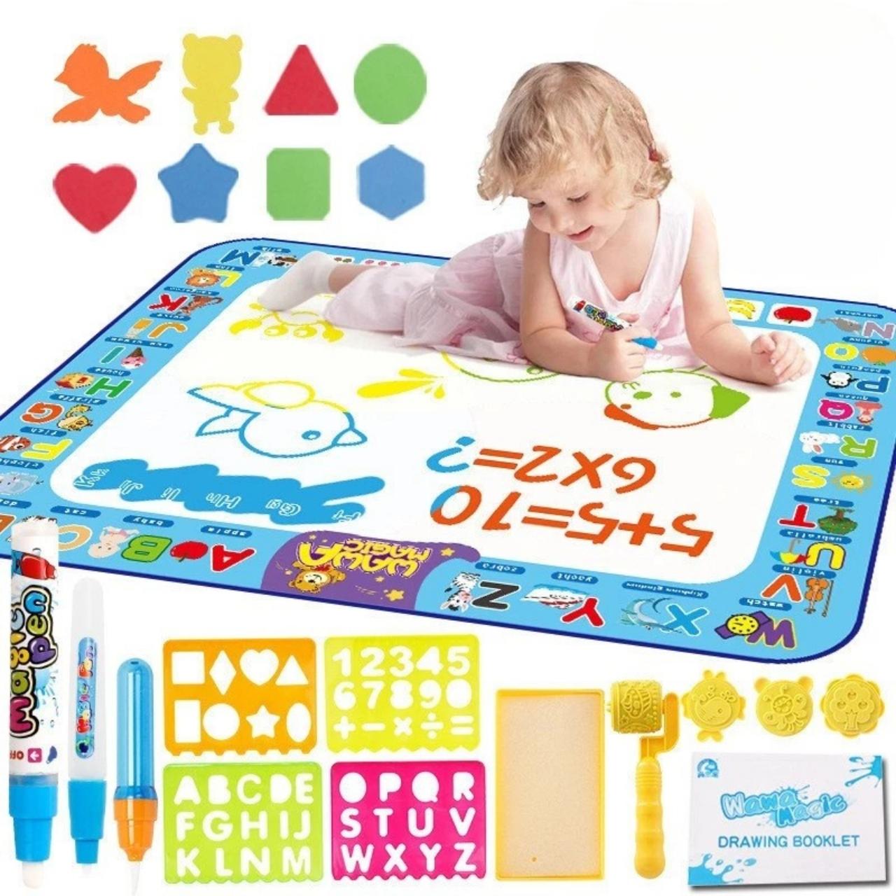 | Nel pacchetto: | 1x tappetino per disegnare con l'acqua (100 ร 80 cm), 3x pennarello ad acqua, 6x stencil + rullo, 1x album da pittura, 1x contenitore per l'acqua |