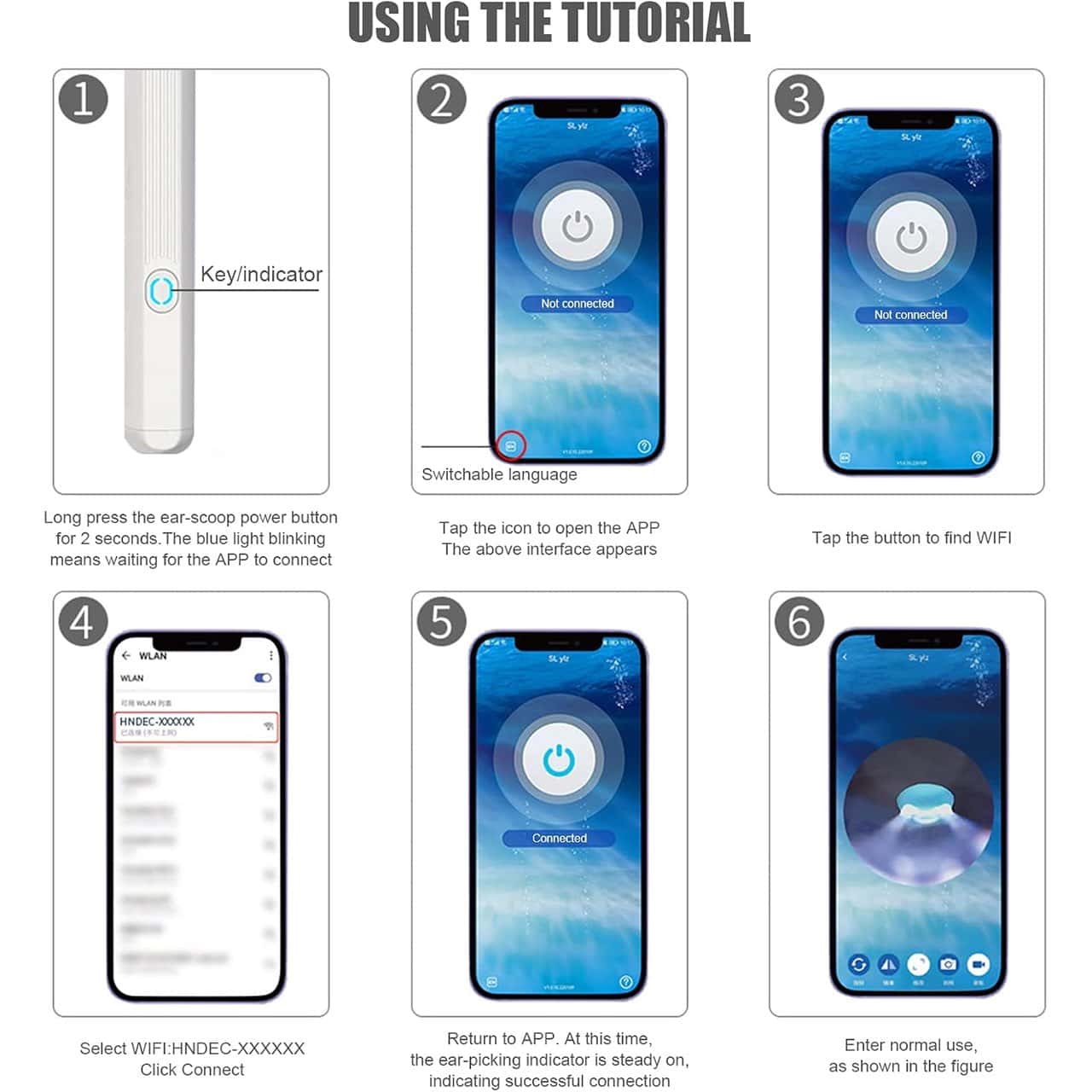 Installa l'app "HND". Rimuovi il prodotto dalla confezione, premi e tieni premuto il pulsante di accensione sulla parte superiore del dispositivo per tre secondi per accenderlo. Poi, nelle impostazioni WiFi del tuo smartphone o tablet, cerca una rete chiamata "HNDEC-xxxxxx" e selezionala per connetterti. Non รจ richiesta alcuna password; il dispositivo si connetterร direttamente. Una volta stabilita la connessione, apri l'app e inizia a utilizzare il pulitore per orecchie, che consente un'ispezione e una pulizia in tempo reale utilizzando la telecamera e le funzionalitร associate.