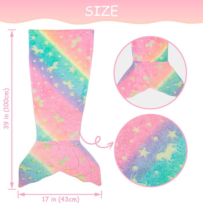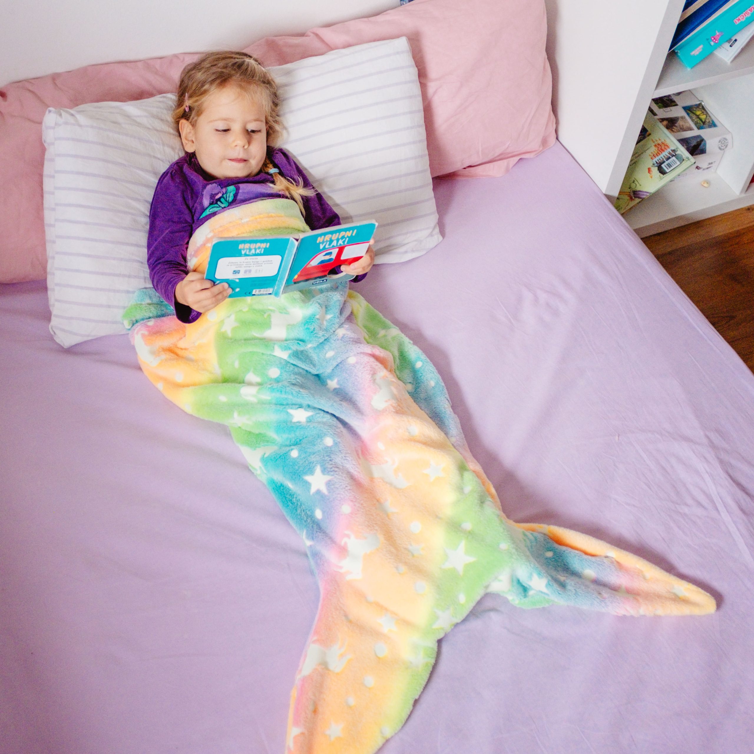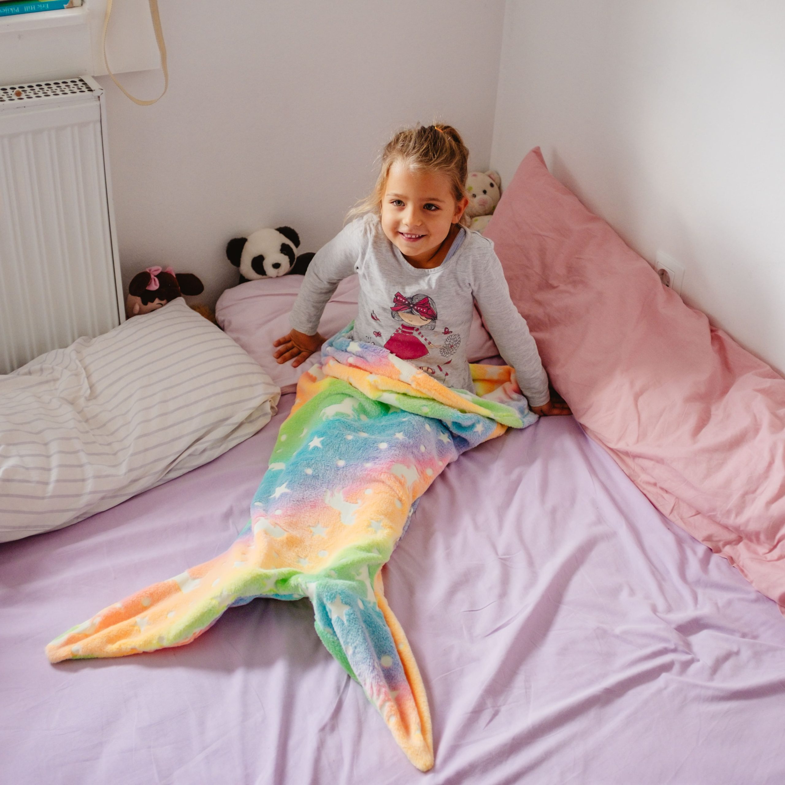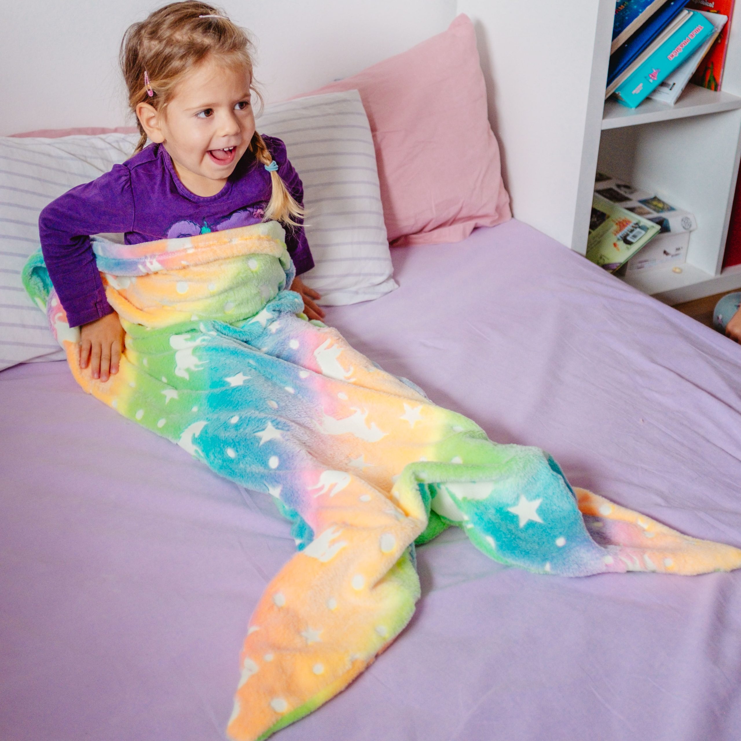 Questa bellissima coperta per bambini a forma di coda di sirena brilla al buio quando esposta alla luce solare!