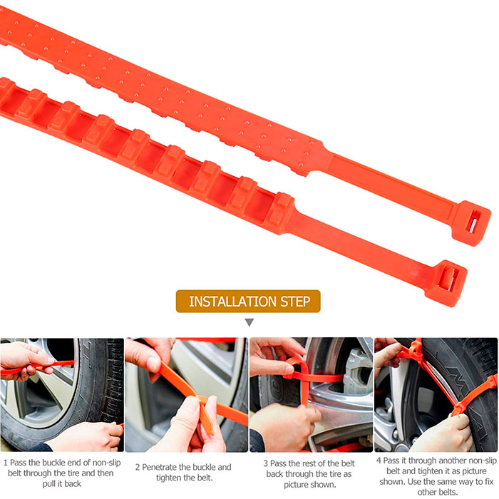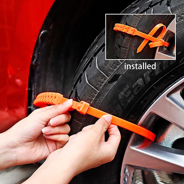 Adatte per auto. Non adatte per camion e altri veicoli con pneumatici piรน grandi. Inserire la fascetta attraverso l'apertura sul pneumatico, tirandola prima attraverso il lato posteriore e poi fissandola sul davanti. Sono riutilizzabili.